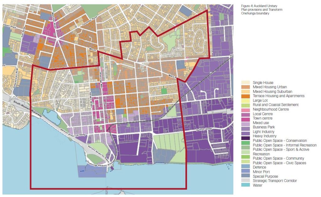 Onehunga is a no-brainer when it comes to urban regeneration and significant growth. Strategically located in the southern part of the isthmus and with pretty good connections to other areas, the Unitary Plan also enables significant growth in the wider area (the area covered by Panuku’s work is outlined in red):