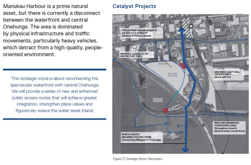 This strategic move is related to the previous one but really seeks to open up the linkages between Onehunga and what should be its best asset – the harbourside location. Once again, East West Link will make this task much more challenging no matter how much NZTA try to put lip-stick on that pig.