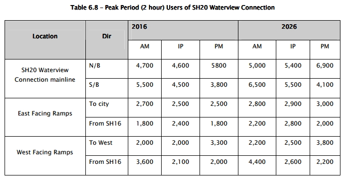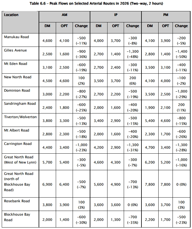 The report also gives some estimates of Waterview’s impact in numerical terms. Here are the changes expected on local roads at different times of the day. The AM Peak is 7-9 am and the PM peak s 4-6 pm – I hope AT have their bus lane paint ready:
