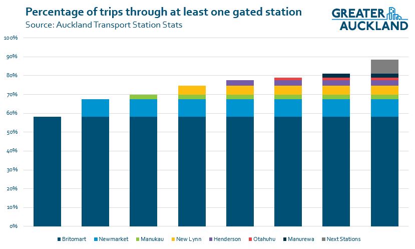 As more stations get gated, the number of people who pass through gates at each end of their journey also increases. From just 5% of trips initially when it was just Britomart and Newmarket, with Manurewa that number is now at 17%. That number will almost double to 33% once the next 5 stations to be gated. The big jump is because most of the trips from those next stations are already to stations that have already been gated.