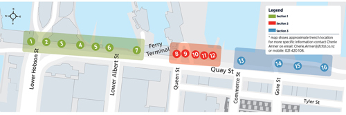 One of the big projects over the next few years will be be the seismic strengthening upgrade to the seawall along Quay St between Princes Wharf and Marsden Wharf. In preparation for that, contractors are currently digging a series of 16 trenches along Quay St to help find out what underground services exist. A map of the trench locations is below.