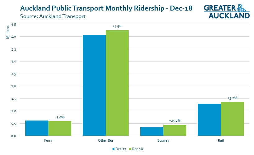 First, we’ve been seeing good growth on PT, particularly on buses over the last six months sine the new network rolled out on the Isthmus in July and on the North Shore at the end of September. Overall ridership in December was up 4.9% on December 2017 which is nice but not as good as we’ve seen in some other months. In saying that, December is always a more variable than most months due to when Christmas falls so that is likely to have played a part – in 2017 there were 16 days in the month before usual holiday period vs 15 days in 2018. But as you can see below, some of that outcome was negatively impacted by ferries which saw a 5% decrease in the month. The data suggests this was primarily driven by drops in usage on the fully commercial services (Devonport and Waiheke).