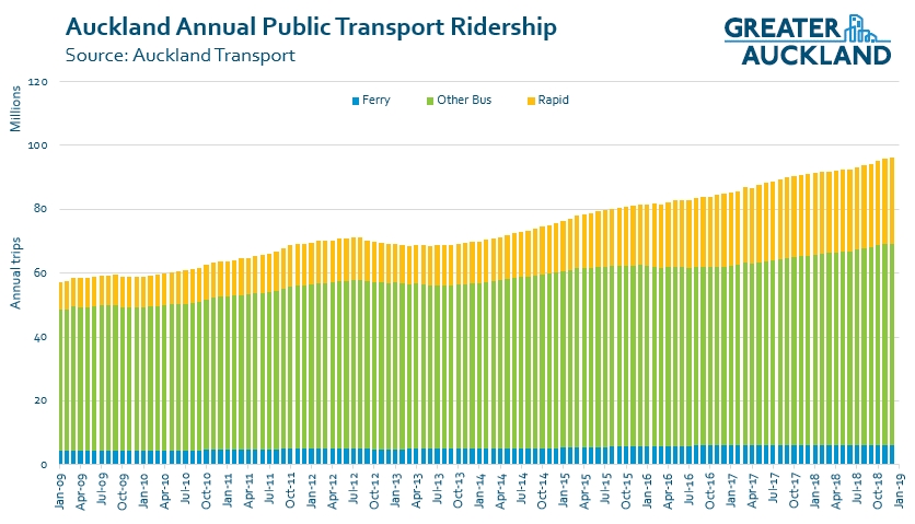 Overall we ended 2018 with just over 96 million boardings, up from 91.1 million at the end of 2017 and most of the growth occurred on the Rapid and Frequent transit network, much of the latter thanks to the roll out of the new network. This suggests our usage 56 trips per person annually, up 1.7 on the 2017 number. This is still low by international standards but much better than 10-15 years ago when it reached a low of just 36.