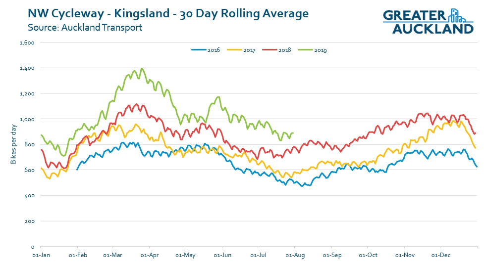 As you can see, one of the top performers continues to be the NW cycleway at Kingsland and growth has been so strong on the route over the last few years that the number of trips recorded in the winter is almost as high as it was during the summer just two years ago.