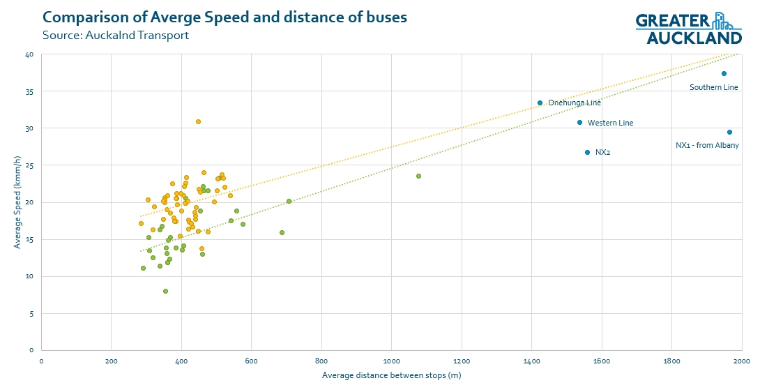 - Most of the green routes are very slow with the exception of a few faster ones, which are generally services from the Shore or Northwest that use the motorways for a portion of their journey. It is particularity notable that many of the isthmus corridors are amongst the slowest, averaging just 13.5km/h at peak times. These tend to be the routes that have some existing bus priority so it is scary to think how much slower they would be without it. The fact that city routes are slower would be further reinforced if I were to include peak only shorter running services, like the 22A, 24W or 27T as the average speed on all of these routes (and other similar ones) was slower than the longer all-day routes.