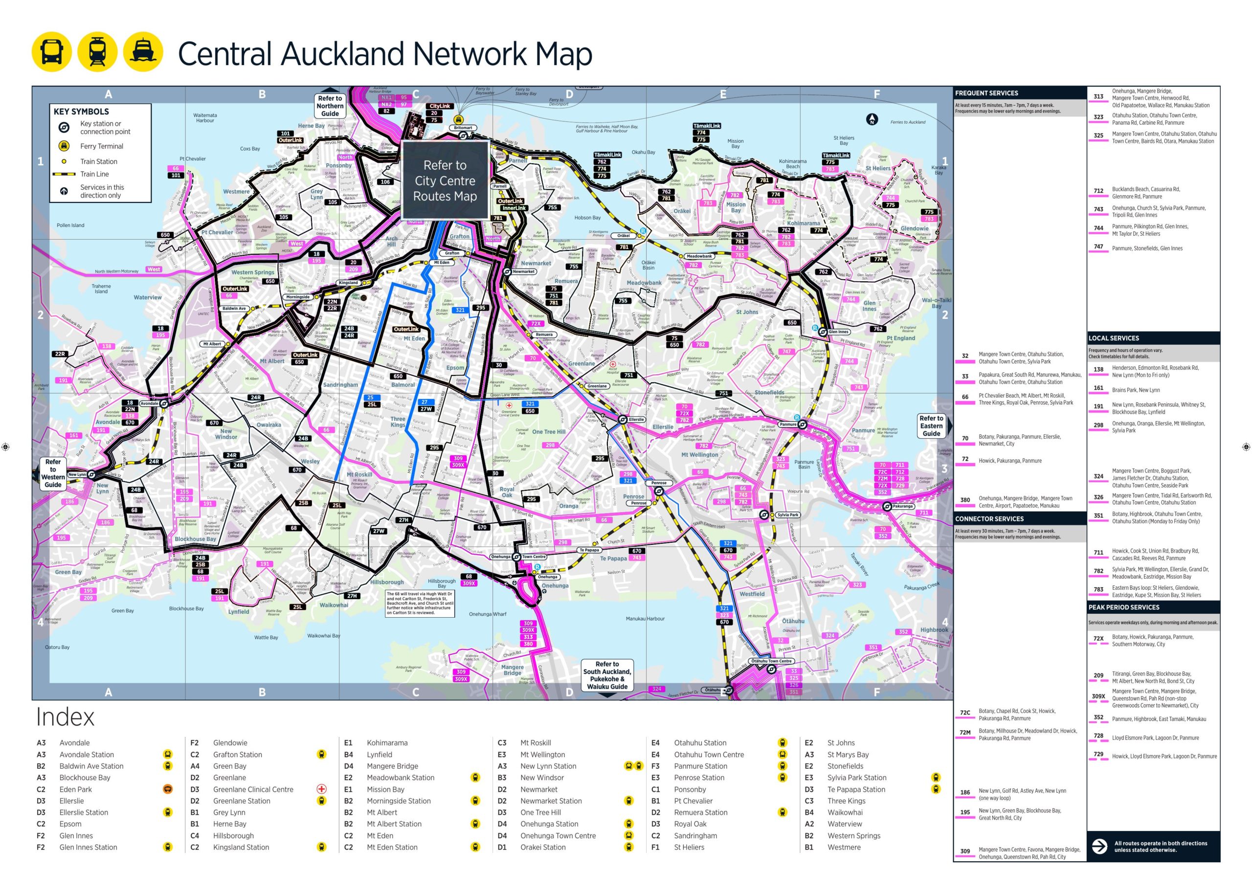 Here are those maps in more detail, starting with the North Shore and Hibiscus Coast and as you can see, there’s a relatively small presence for NZ Bus on the Shore these days but includes an important frequent route in the 82 between Milford/Takapuna and the city.