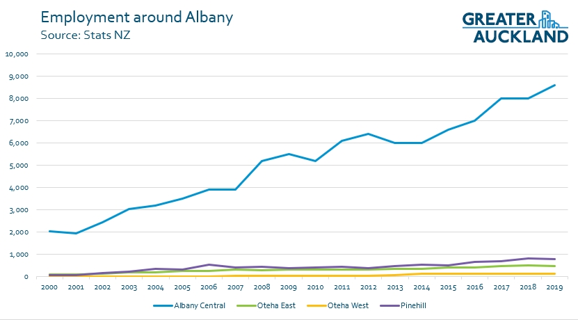 Of course we also need to think about employment catchment as we want public transport to be useful for people getting to Albany to work just as much as we want it to be about people commuting to the city. Unsurprisingly on this metric Albany again scores highly. This uses the newer Statistical Area Unit 2 which splits Albany off from Albany from Albany heights and splits Northcross into Oteha East and West. We also don’t have projections for employment only the data from 2000 to 2019 however we know there’s a lot more growth coming, such as the Council’s recent decision to move hundreds of staff to a new building there.