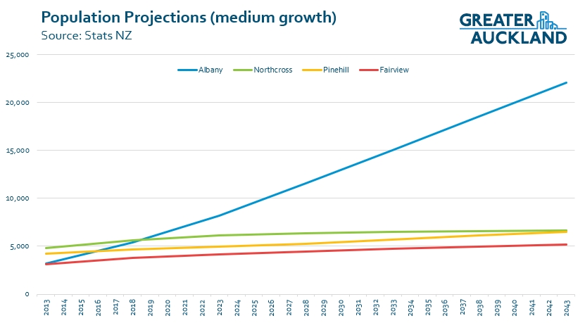 Nonetheless, if we compare Albany with those area units immediately to the west we get these population projections out to 2043 based on the medium growth scenario. On the high-growth the eastern sides do grow a little bit more but it sees Albany reach 25.5k people.