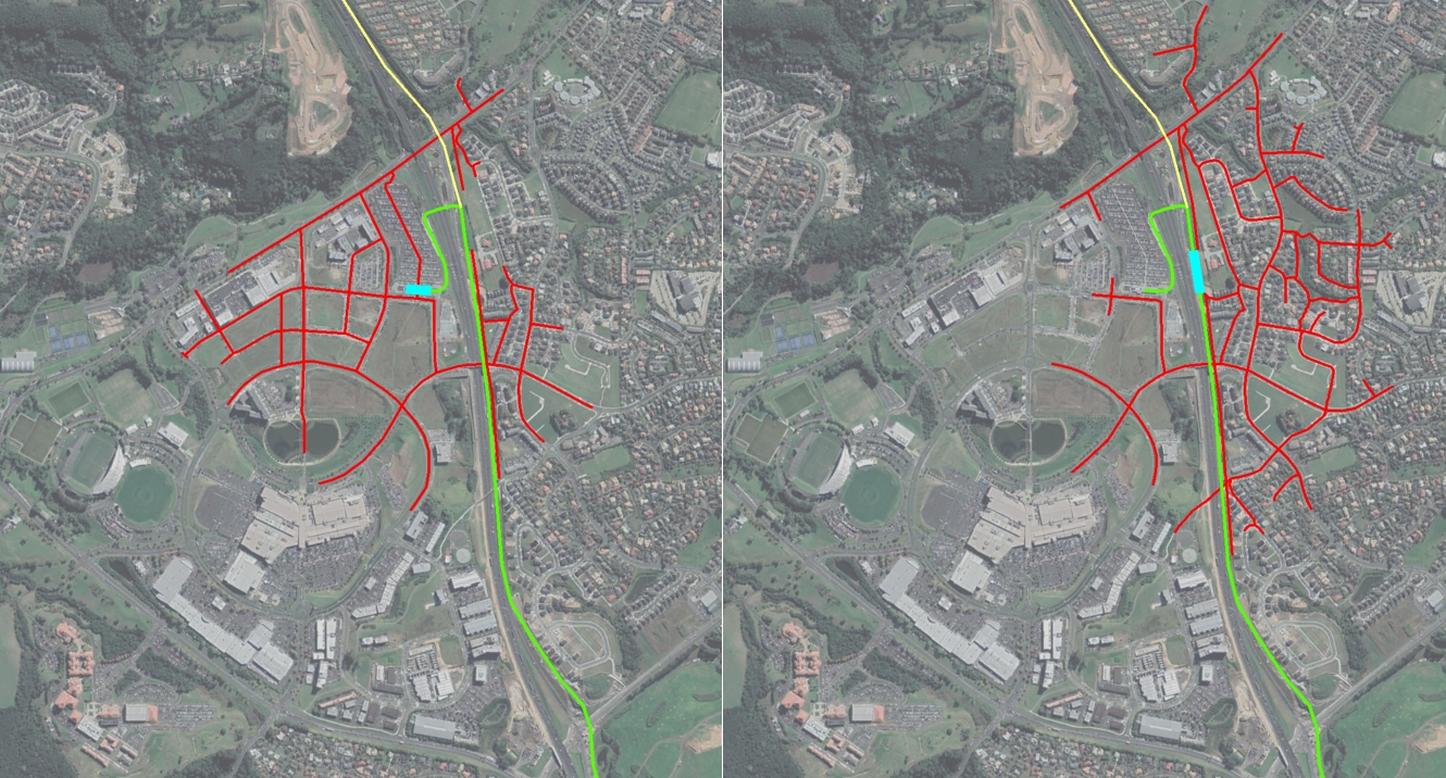 As well as better access to the Albany station, the other thing that’s notable from those walking catchments above is that the existing station being at the Northeast of Albany doesn’t do a good job of serving the south and west of Albany, such as the stadium, Massey University and the growing numbers of commercial buildings such as around Corinthian Dr. A western alignment could also have allowed for a second new station closer to these areas which would have further increased the coverage and usability of the busway.