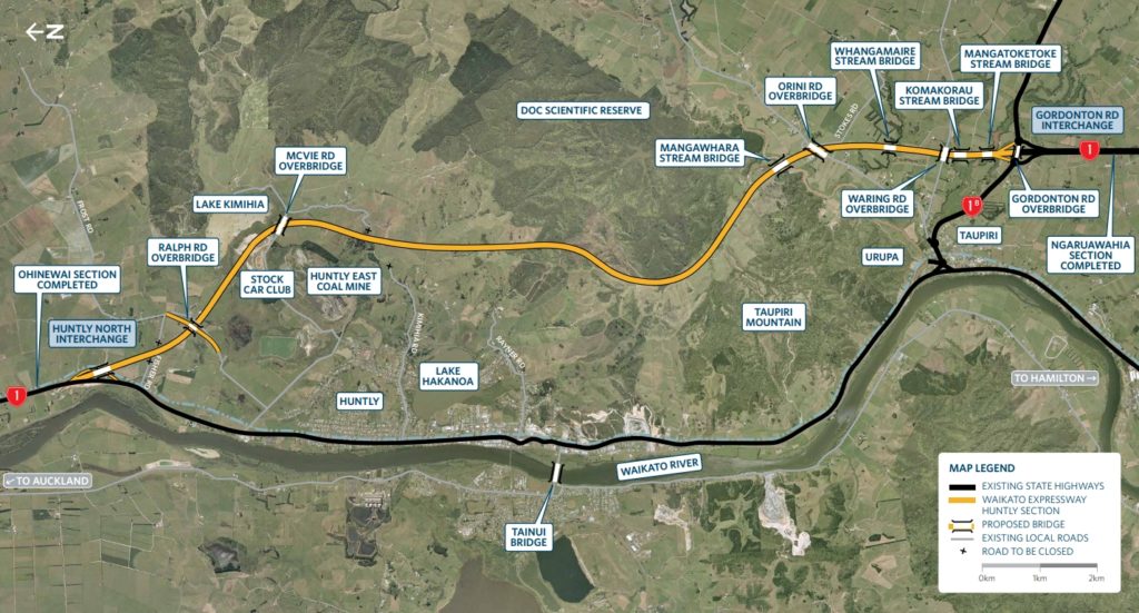 While CRL is just kicking off, the second to last section of the Waikato expressway is officially being opened today. As the name implies, it will see Huntly (and Taupiri) bypassed and will link in with the Ngaruawahia section that was completed in 2013. Overall the project is $15km long and has cost $409 million and involved about 3 million cubic metres of earthworks, including a 60m cut through the back of Taupiri Mountain.