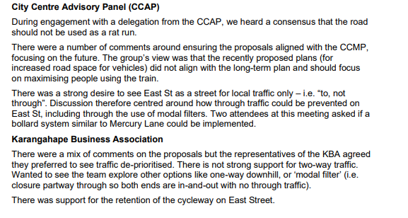 As always, keep it positive and friendly. The key point is that the Local Board should resist any temptation to once again water down these recommendations (e.g. softening the bollards on Mercury Lane, or squeezing on-street carparks back into Cross Street).