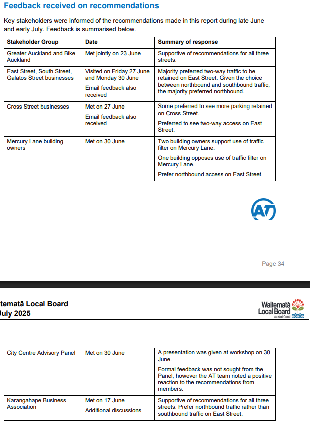 Auckland Transport received a high volume of emails. The majority of these emails queried why Auckland Transport had made changes and urged AT to revisit the design and reinstate features such as the East Street cycleway and the interim footpath on Cross Street. Feedback came from a variety of people including residents and businesses in the area, the media, elected members and people from other parts of Auckland.