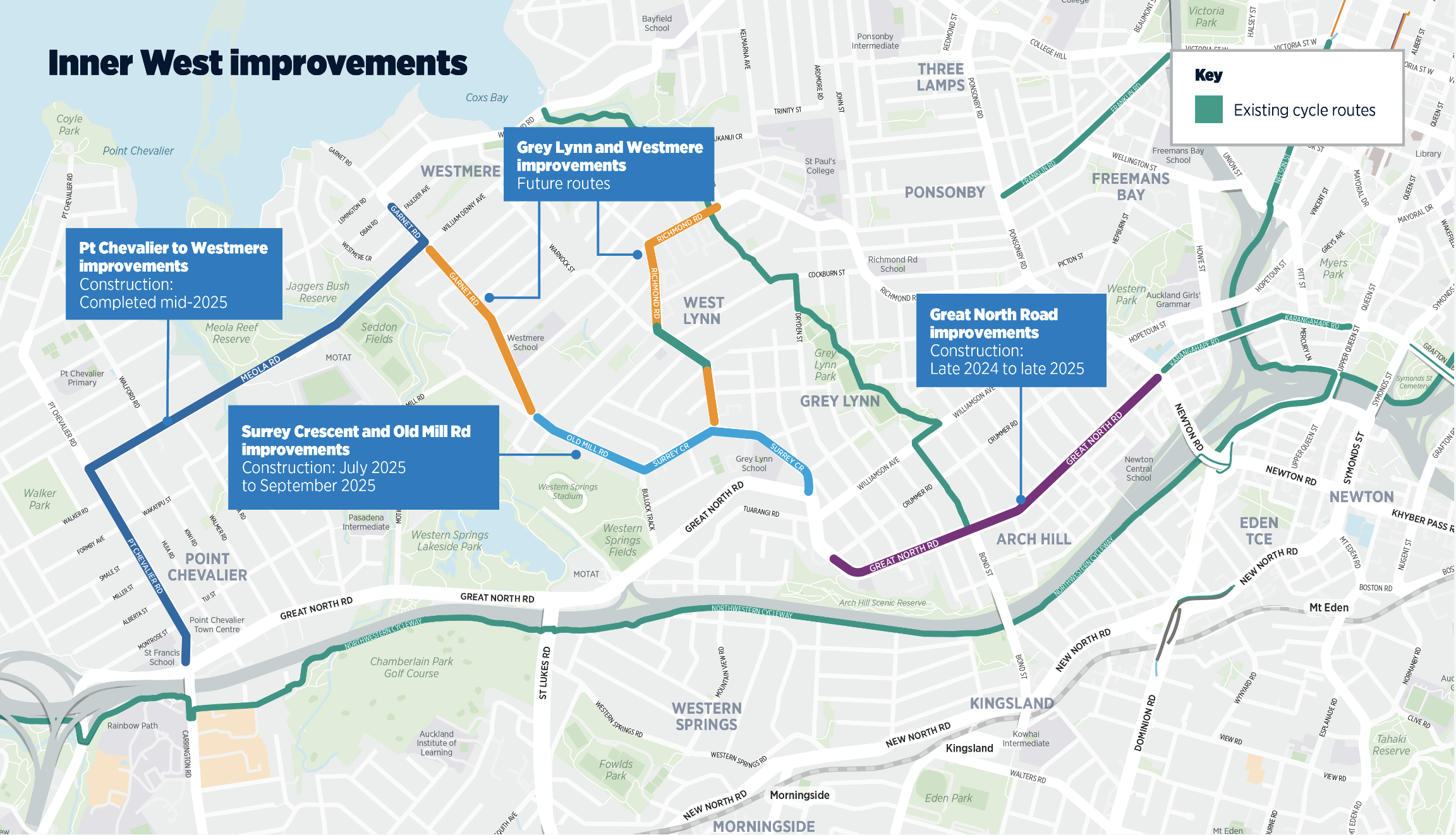 Two key puzzle pieces remain for completing the Inner West network: the glaring Bermuda Triangle at the Grey Lynn shops (Great North Road/ Williamson), and lovely wide Garnet Road, from Old Mill Road past Westmere School to the Meola roundabout, which looks like an easy win.