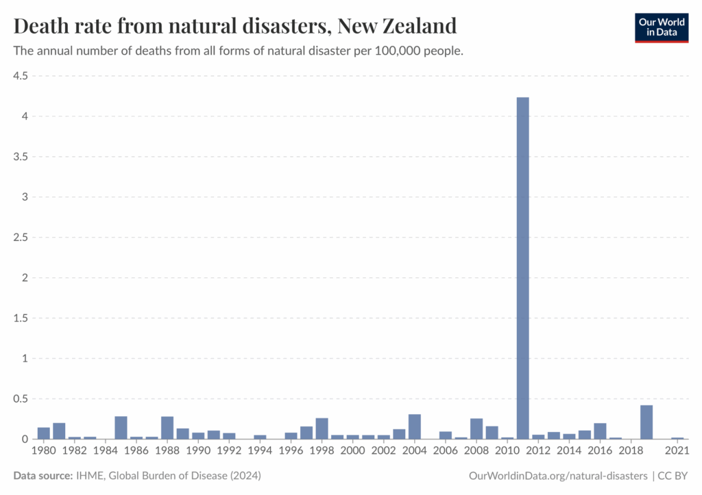 Our death rate from disasters is low. The most fatal years (2011 and 2019) were from the Christchurch Earthquake and Whakaari White Island’s eruption. Cyclone Gabrielle killed 11 people, a death rate of 0.22 people per 100,000.
