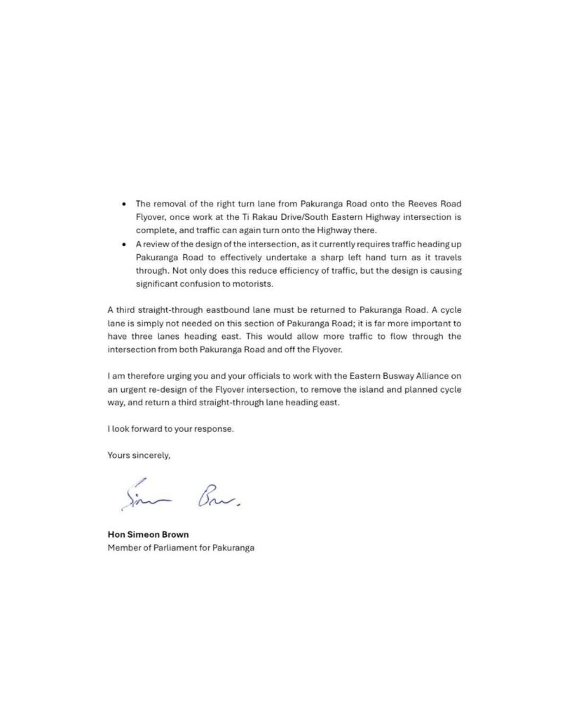 Brown’s letter dives right into the details, pressuring AT to redesign the project at the last minute – something that always comes at great cost, but who pays? You can also see Brown ramping up one of his favourite culture wars, attempting to blame a (currently non-existent) planned stretch of cycleway for the traffic issues, and claiming the space is urgently needed for yet another traffic lane.