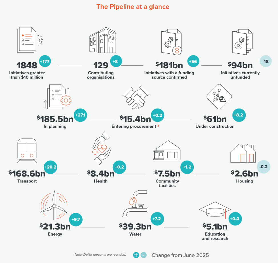 Notably, a few days ago Bishop released the latest quarterly Infrastructure Pipeline snapshot, which shows transport making up over 61% of all projects in the nation’s pipeline of all infrastructure. Some other ways to think of the numbers in the graphic below: