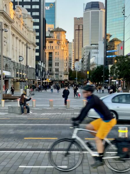 Till then, we have little reason to change course, beyond a few tweaks (e.g. the timing of traffic signals, to facilitate easy movement of people and public transport in particular). Because, even without the supporting purpose of an operating CRL, the city’s new spaces that have been completed are already self-evidently successful – witness Quay Street and Te Komititanga below where I’m speaking from.