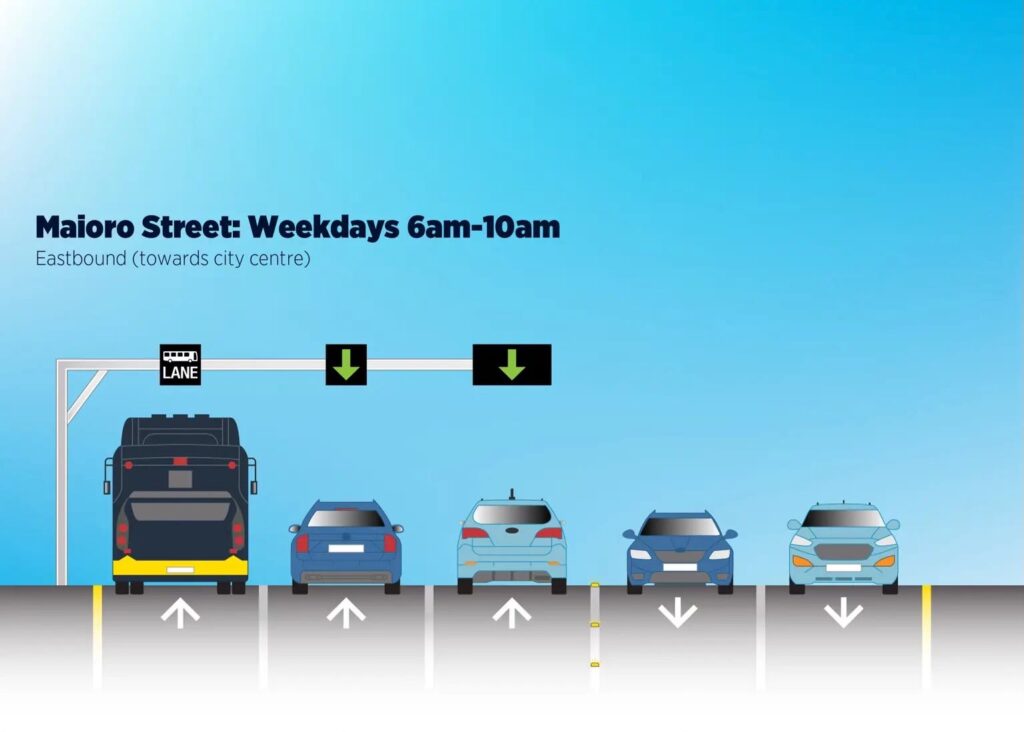 An eastbound dynamic bus lane launched on congested Maioro Street. This works by having the kerbside lane on Maioro Street eastbound becoming a dedicated bus lane from 6am to 10am on weekdays, reducing travel times for citybound buses.