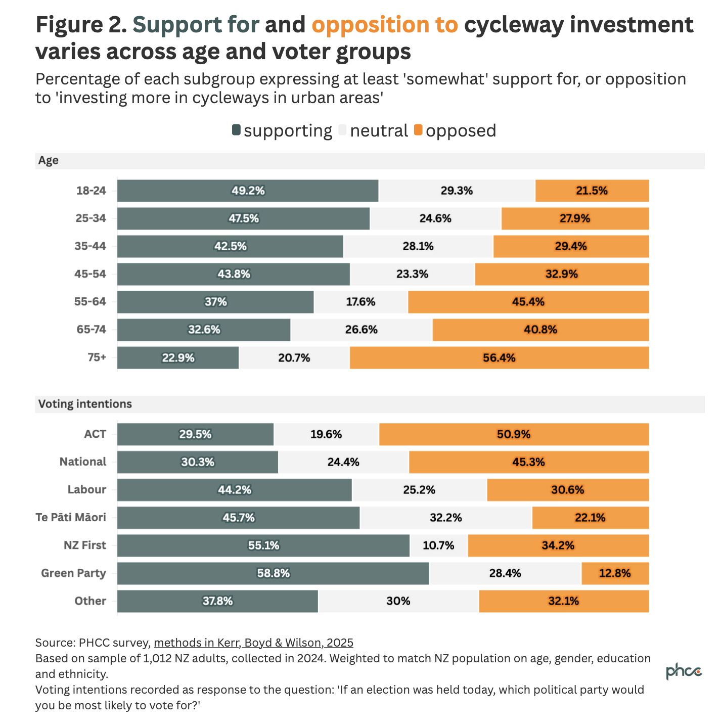 Our survey of 1000+ New Zealanders found that more people support increasing investment in urban cycleways than oppose it (41% vs 35%), but that 24% were “neutral”. Results indicate significantly higher support amongst younger people, Māori, and those in the highest income bracket.