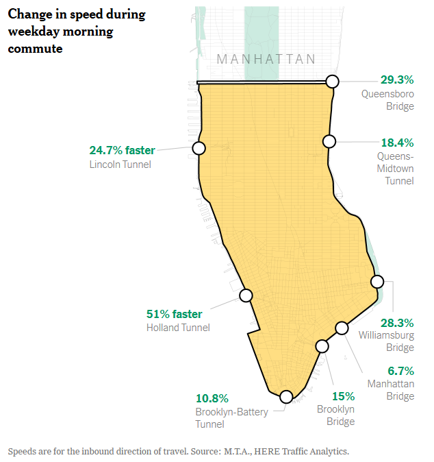The New York Times has a great article looking at the impact of congestion pricing (gift link) after one year of operation.