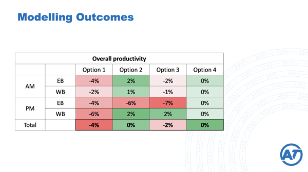 Page 7 of that presentation shows the results of “productivity” modelling – and somehow Option 1, the design with a protected two-way cycleway, gets the worst results.