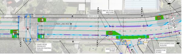 Another key point: the 2023 design confirms that it’s possible to include dedicated and protected space for people on bikes on Green Lane West, in the form of a two-way protected bike path on one side of the road.