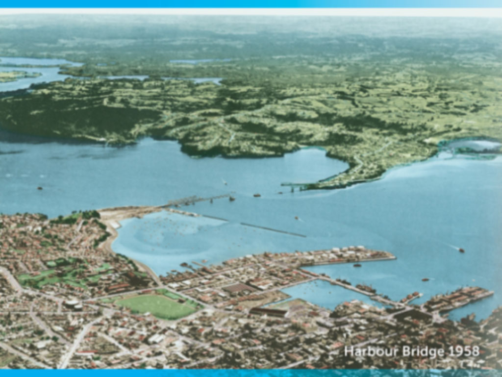 The harbour bridge under construction, about the fish the Shore, Maui-like out of the sea, into late 20thC auto-dependent suburbia.
