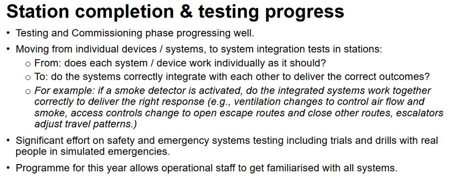 - Testing of all of the hardware and systems in the tunnels and stations appears to be on track with no major issues identified yet
