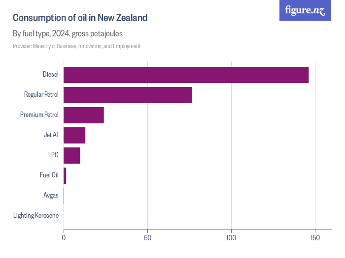 Chart via figure.nz, showing Consumption of oil in New Zealand, by fuel type (2024).