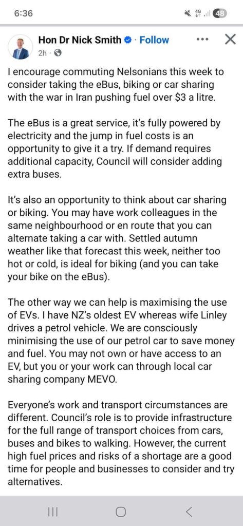 Electrification is surely the ultimate cross-party strategy. With so many benefits. Here is Nick Smith, former National Party minister, now mayor of Nelson, urging people to make choices to avoid the fossil fuel use. We will all be better off when more New Zealanders have that choice as the best option in more of their daily life:
