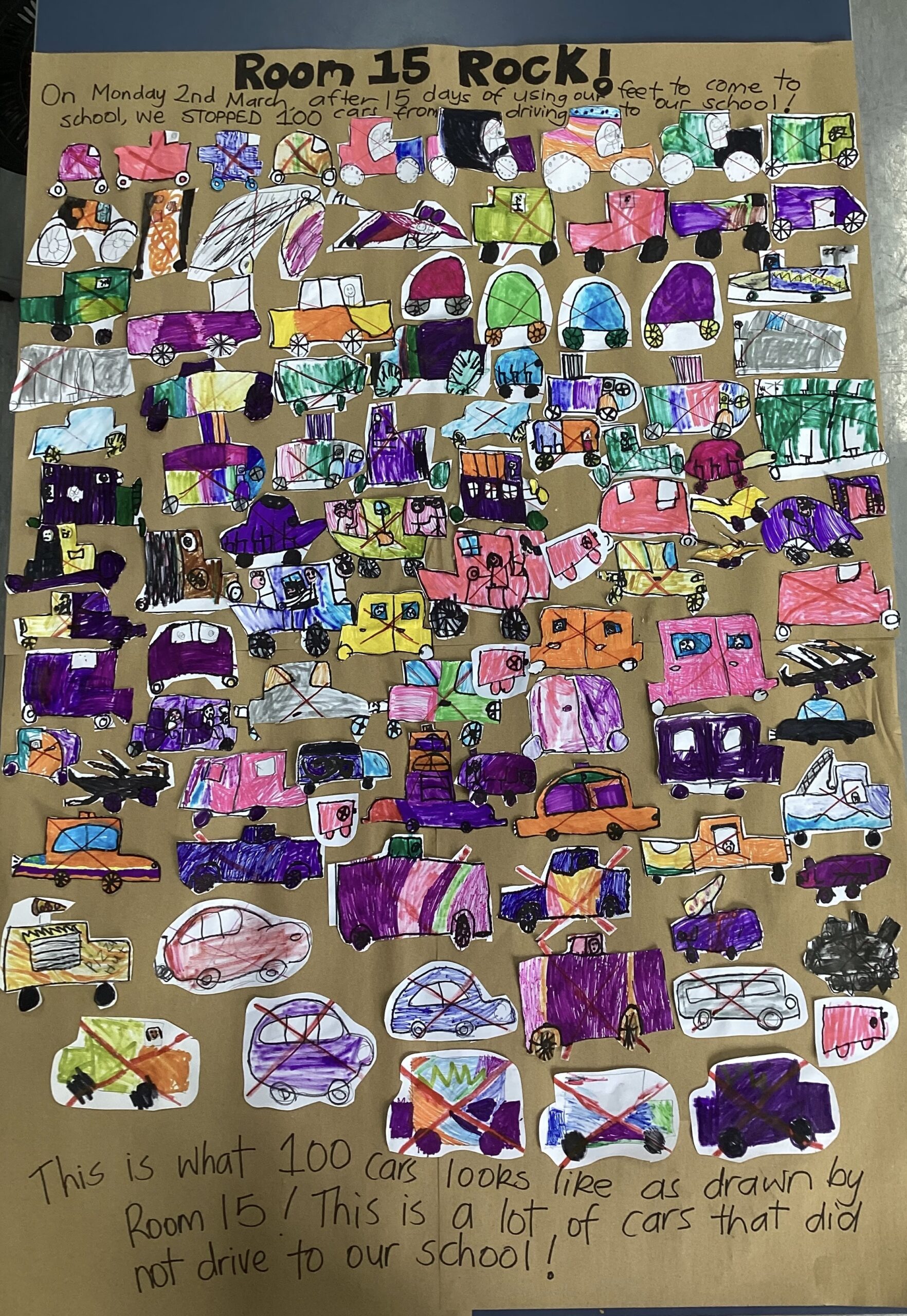 “On Monday 2nd March, after 15 days of using our feet to come to school, we STOPPED 100 cars from driving to our school! This is what 100 cars looks like as drawn by Room 15! This is a lot of cars that did not drive to our school!” (Image supplied)