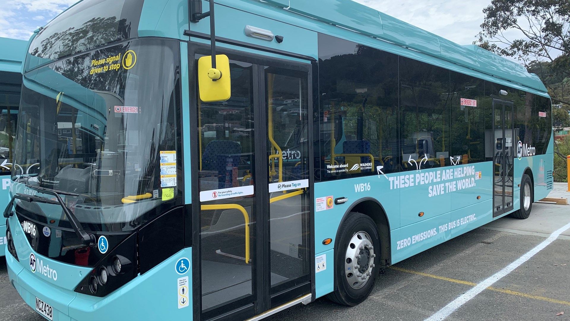AT’s bus fleet on Waiheke is fully electric (“Great Green Waiheke Machines”) and the livery on this one sweetly notes the passengers are “helping save the world”. Image: Fullers 360