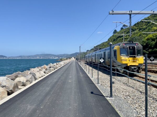 Two diesel-free systems: Wellington’s electric Matangi passing the nearly complete Te Ara Tupua walking/ biking path. Photo: Patrick Reynolds, January 2026