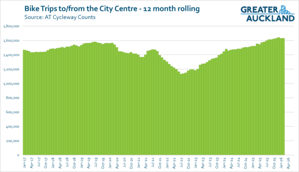 The latest city-wide cycle counter data available from AT is February, so we can’t graph the March impacts yet (to match the observed activity). But here’s the city centre cordon bike count, to the end of February 2026. The return to form after early COVID interruptions is pretty clear.