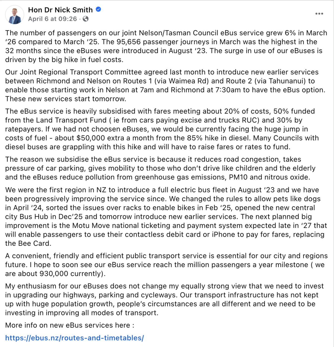 Nick Smith, Mayor of Nelson, Facebook post 31 March 2026.