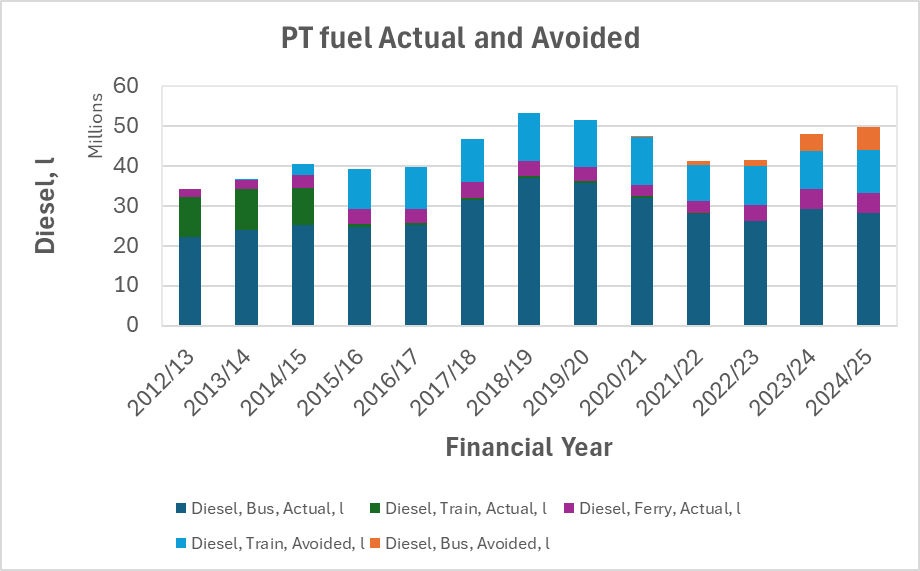 Anyway, the key bars are the top two. These show the quantity of diesel (in millions of litres) that was not burnt in the public transport sector in Auckland since the electrification of the rail system and the introduction of e-buses.